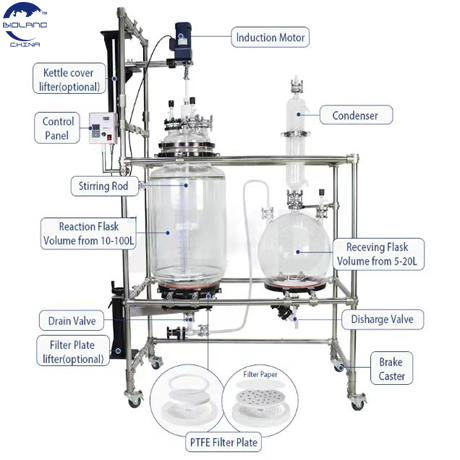 The Solid Phase Crystallization Filter Crystal Reactor for Peptide synthesis adopts High borosilicate glass or customize stainless steel kettle cover and kettle body, which are electrolytically polished and connected by flanges, which is convenient for disassembly, cleaning and replacement. The reactor is equipped with replaceable tetrafluoroethylene filter plates, which can be used for stirring, filtration, suction filtration, peptide synthesis, crystallization, pyrolysis and other processes. the glass solid phase reactor, it has a wider application range and can be operated under positive pressure conditions.