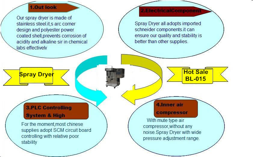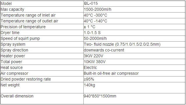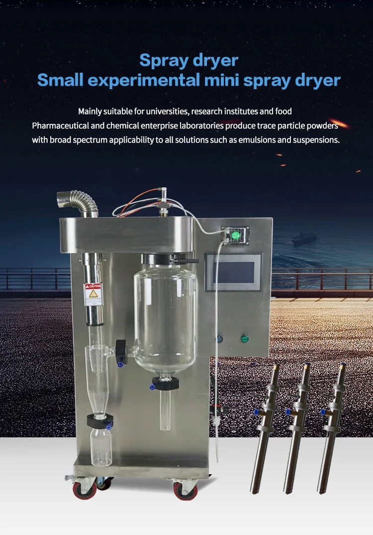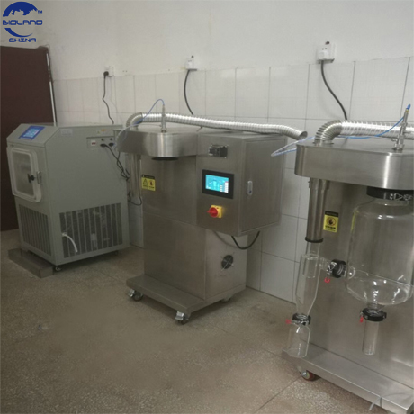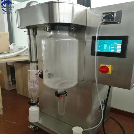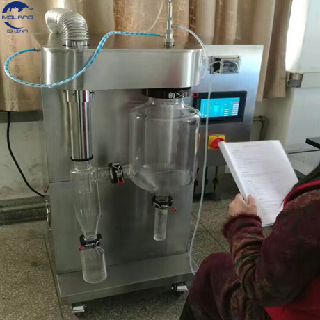 lab scale Spray Dryer is suitable for making and drying various powders such as milk royal jelly, medicine, chemical materials, etc. At a high speed of dying with hot-air flow, 95%~98% water can be evaporated at a moment. The drying process only needs several seconds.