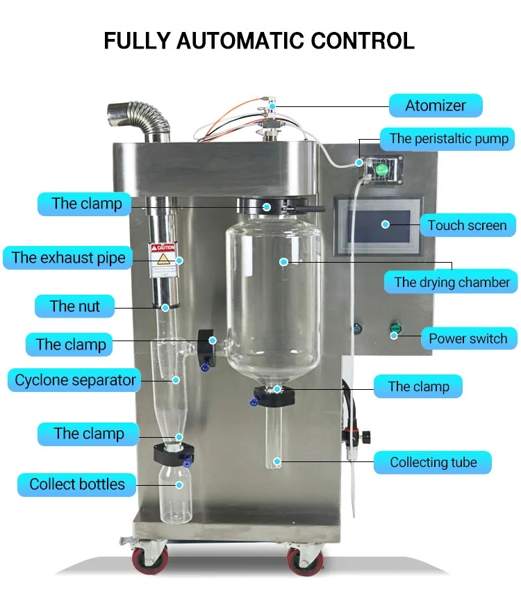 4. The spraying, drying and receiving system are made of high borosilicate glass, which has the advantages of visualization of cleaning process, visualization of atomization process, strong acid and alkali resistance, etc.