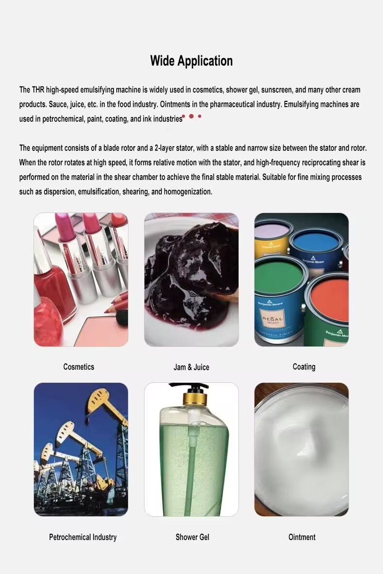 The high shear dispersing emulsifying machine is driven by a compact series micro high speed motor, which is suitable for mixing low to medium and high viscosity liquid in laboratory or pilot plant, crushing granular materials and shearing emulsifying them in liquid medium.