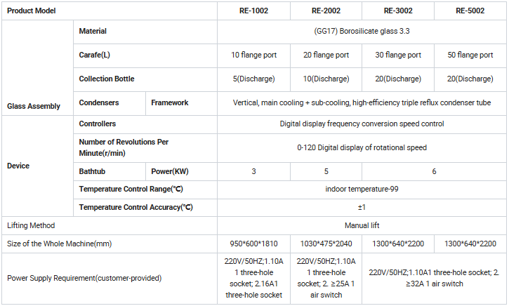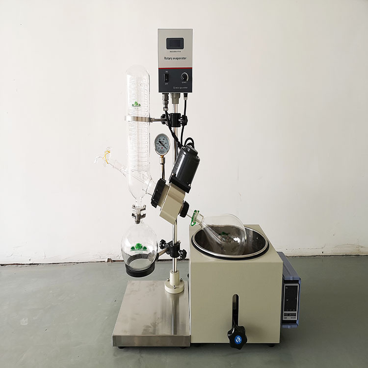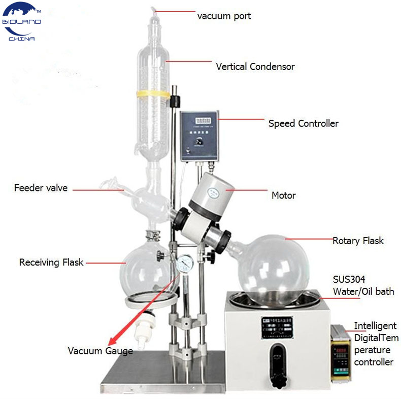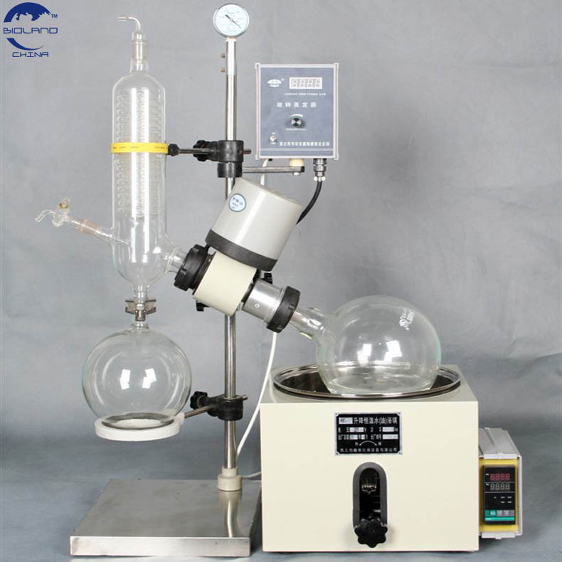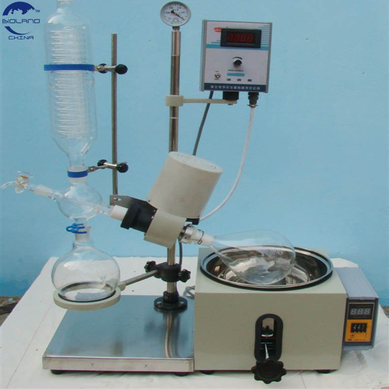 The rotary evaporator is made according to the principle of constant temperature heating and film evaporation under vacuum and negative pressure. The rotary evaporator uses stepless speed regulation to make the glass rotating bottle rotate at a constant speed, and the materials form a large area uniform film on the bottle wall.