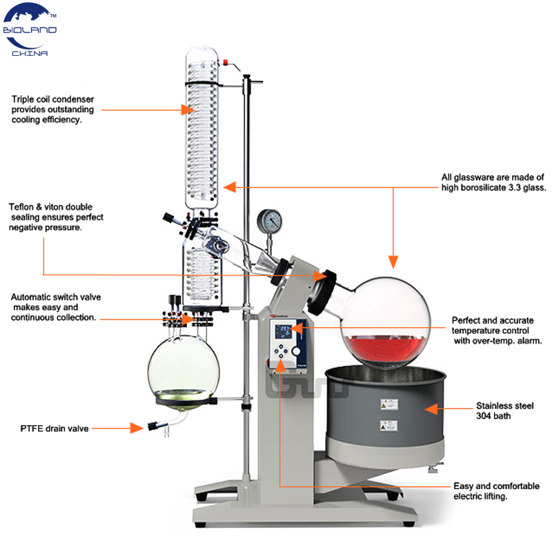 Working principle: Using vacuum to reduce boiling point, rotating the bottle to form a thin film, heating and evaporating, commonly used for condensation recovery, solvent removal, concentration, drying, and recovery