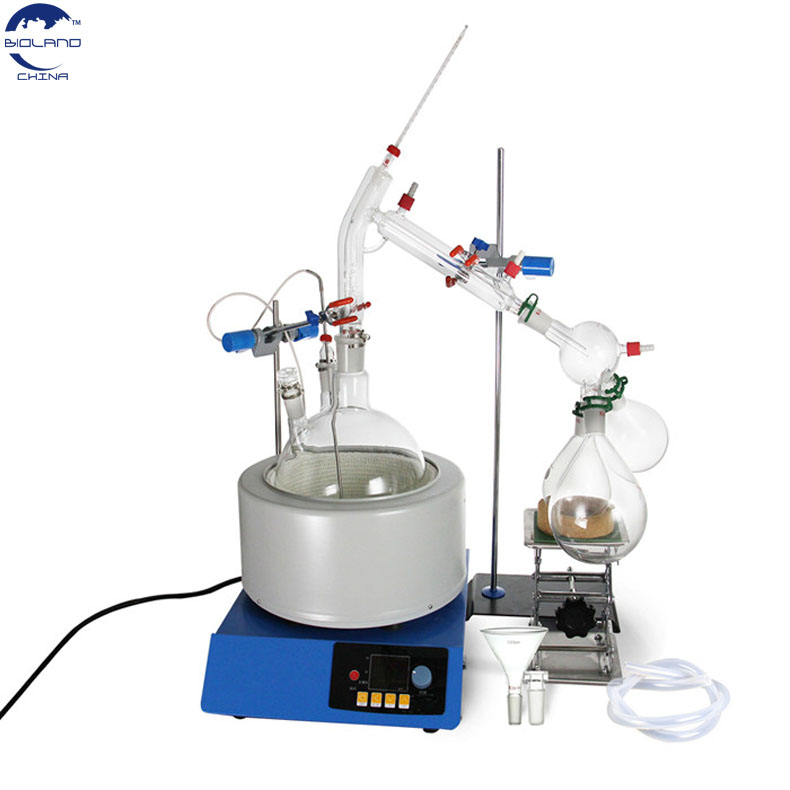 Short path distillation is mainly used for enrichment, crystallization, separation, drug extraction, solvent recycling, pharmaceutical and biological industry, etc. In vacuum conditions, material was heated and mixed with constant speed rotation in the evaporating flask by the electric mantle. And Large area of thin-film spreads on the cylinder glass wall. With efficient glass condenser, recycling collection, and dissolved steam, improve the efficiency of evaporation. It is suitable for intensive purification of biological products, especially suitable for high-temperature decomposition.