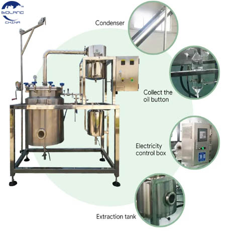 Our essential oil extraction equipment, health products, biological drugs, cosmetics, and food. This uses technology and chemical separation can extract plant components efficiently by steam distillation and have a good effect in collecting essential oil from plants.