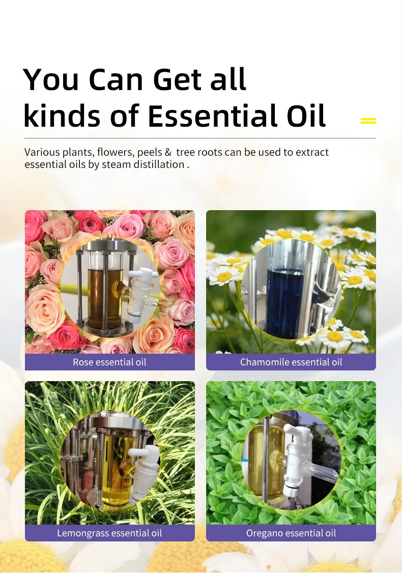 This water Plant volatile oil hydrolate distillation extraction equipment is suitable for extracting and collecting volatile oils from plants and flowers in industries such as food, pharmaceuticals, chemicals, and spices.