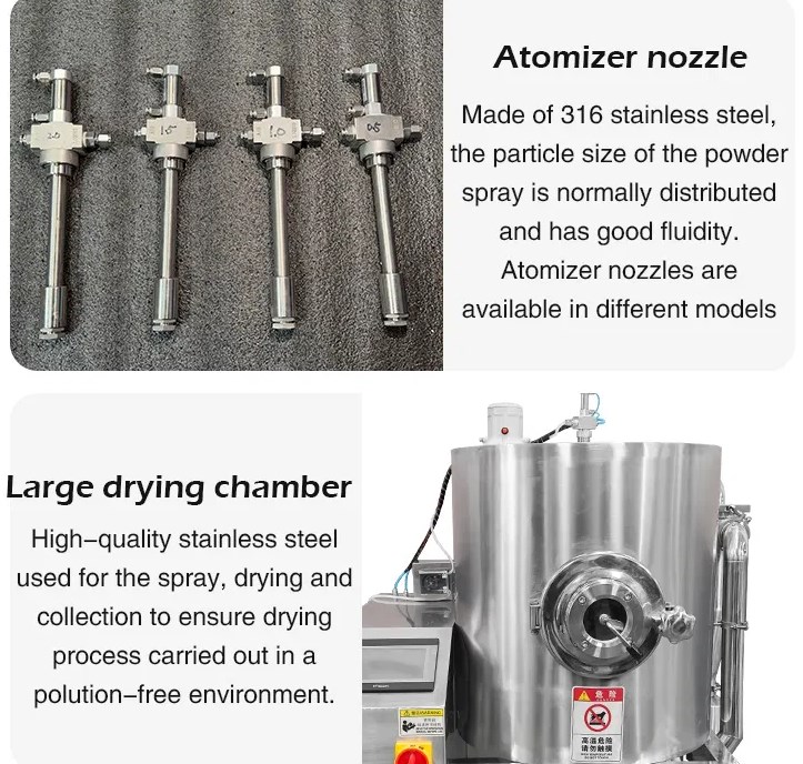 The entire Low temperature spray dryer machine is compact and complete with no need of any other facility to operate. One-touch boot, large color LCD touch screen, either automatic or manual control, convenient for monitoring of operation and experiment. In particular, it achieves rapid material drying at low temperature (50ºC) and provides very convenient and safe drying method for thermo-sensitive materials, such as biological product, high carbohydrate traditional Chinese medicine natural product extract, thermolabile polymer material, heat gasification material and so on.