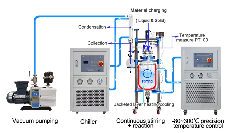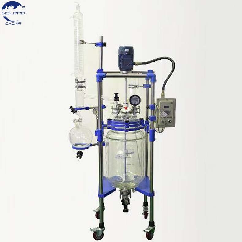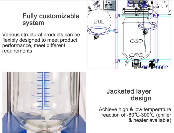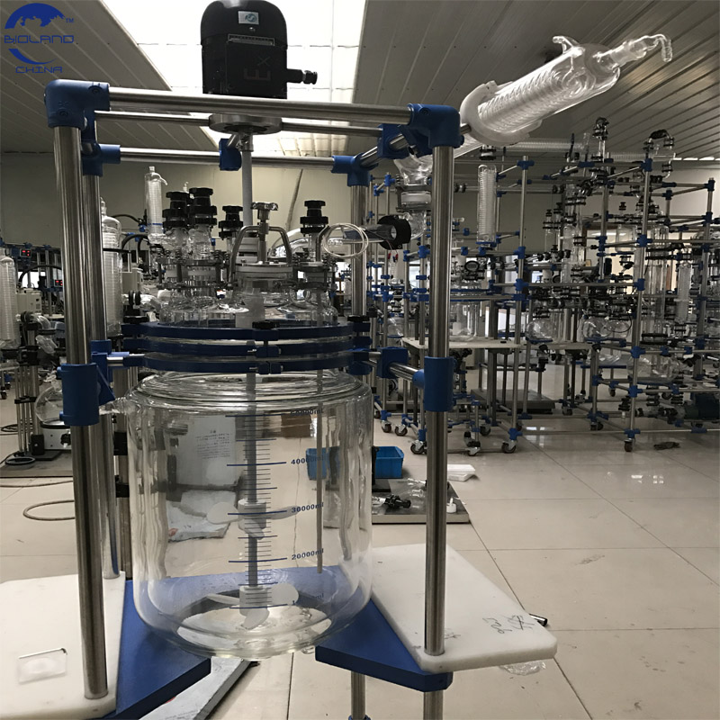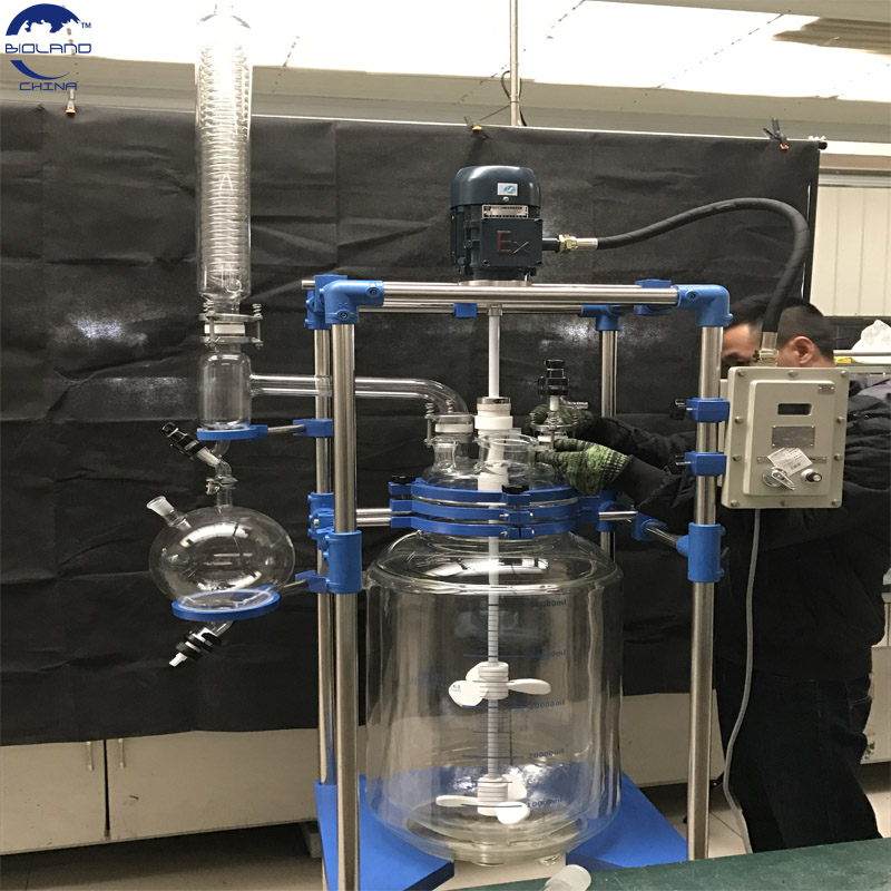 The Distillation Column Jacketed Glass polymerization reactor is mainly used for testing and production in the pharmaceutical, chemical, biological products and other industries. This product is under the vacuum negative pressure condition, using the principle of constant speed stirring to uniformly stir the raw materials, so that the material can fully react in the kettle body. The glass interlayer can be externally connected with high temperature circulation equipment to heat, evaporate, separate and recover the materials in the kettle. And other operations; external refrigeration cycle equipment can also be used to react to low temperature reaction in the kettle; if there is heating and cooling in the material reaction process, external high and low temperature circulation devices can be used. Moreover, the contact parts with materials are all made of high-temperature and corrosion-resistant high borosilicate glass and polytetrafluoroethylene material, which is especially suitable for the reaction of easily decomposing denatured biological products, and is not easy to react with various materials.